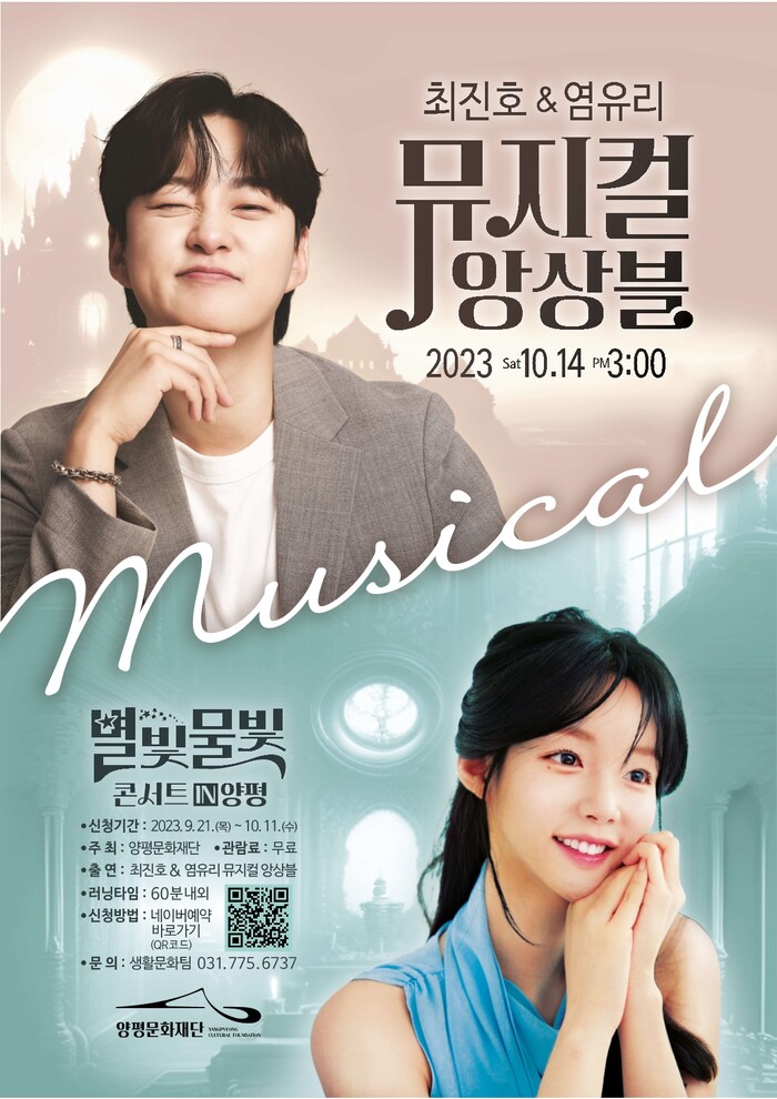 양평문화재단(이사장 박신선)은 오는 14일 오후 3시, 양평문화재단 2층 씨어터 양평에서 <별빛물빛 콘서트 in 양평> 네 번째 무대로 최진호·염유리를 초청해 클래식과 크로스오버 음악의 장르를 넘나드는 공연을 개최한다.