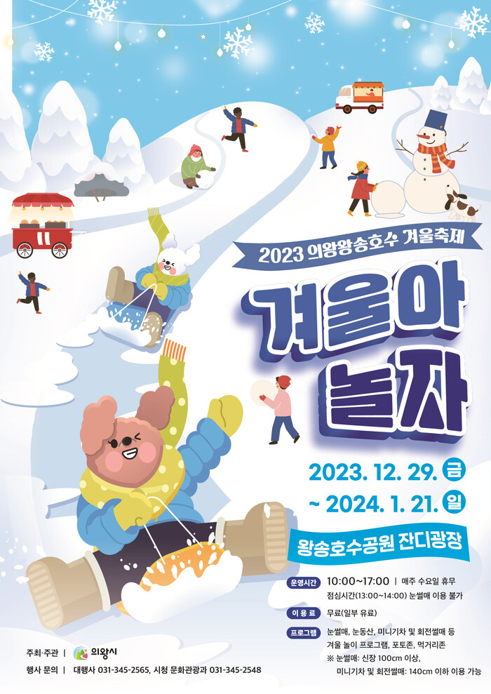 의왕왕송호수 겨울축제 운영시간은 오전 10시부터 오후 5시까지(점심시간(13:00~14:00) 눈썰매 이용불가)이며, 매주 수요일은 휴장한다.