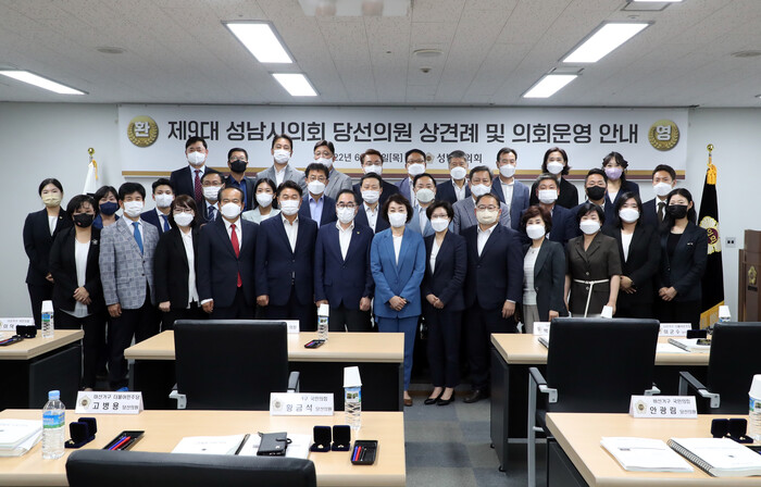 성남시의회(의장 윤창근)는 6월 23일 성남시의회 4층 세미나실에서 제9대 성남시의회 당선의원 34명과 의회사무국 직원들이 참석한 가운데 첫 상견례 및 의정 특강을 개최하였다.