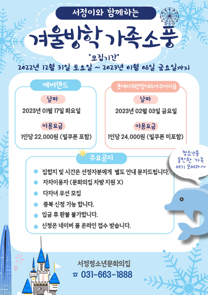 이번 겨울방학 특별프로그램은 청소년들과 가족들이 함께 즐거운 시간을 보내며 계묘년 새해의 첫 다짐과 가족간의 화합을 다지는 보람찬 추억을 만들 수 있도록 오는 17일(화) 에버랜드와 2월 3일(금) 롯데타워 & 아쿠아리움 소풍 프로그램을 준비했으며, ‘2023 서정이와 함께하는 겨울방학 가족 소풍’ 참여 희망자는 서정청소년문화의집 네이버밴드에 게시한 링크를 통해 신청이 가능하다.