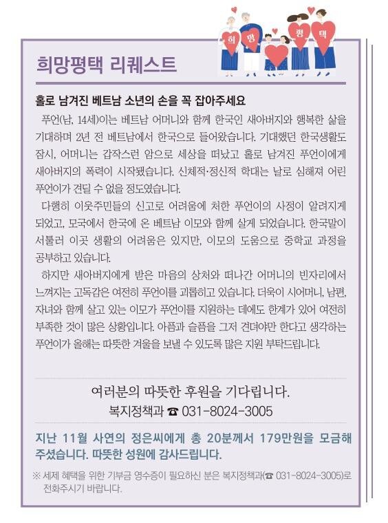 [로컬라이프] 평택시(시장 정장선)는 지난 2020년 한 해 동안 희망평택 리퀘스트를 통해 220여명의 시민이 기부에 참여해 2,100만원이 모금되어 경제적으로 어려움을 겪고 있는 12가구에 소중하게 전달됐다고 밝혔다.