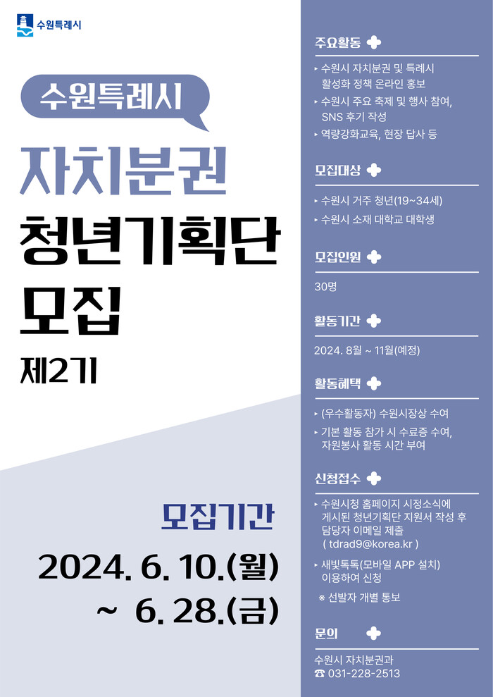 수원시(시장 이재준)가 SNS를 활용해 수원시 자치분권·특례시 활성화 정책을 홍보하는 ‘수원특례시 자치분권 청년기획단’을 28일까지 모집한다.