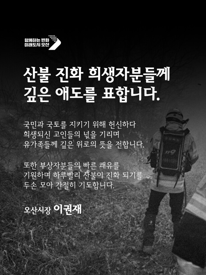 이와 관련해 이권재 오산시장은 25일 자신의 페이스북을 통해 경상도지역에 산불로 인해 막대한 피해가 발생하고 있고 특히, 산불을 진화하던 소방·산림·공무원 관계자들의 안타까운 희생도 있었다고 전했다.