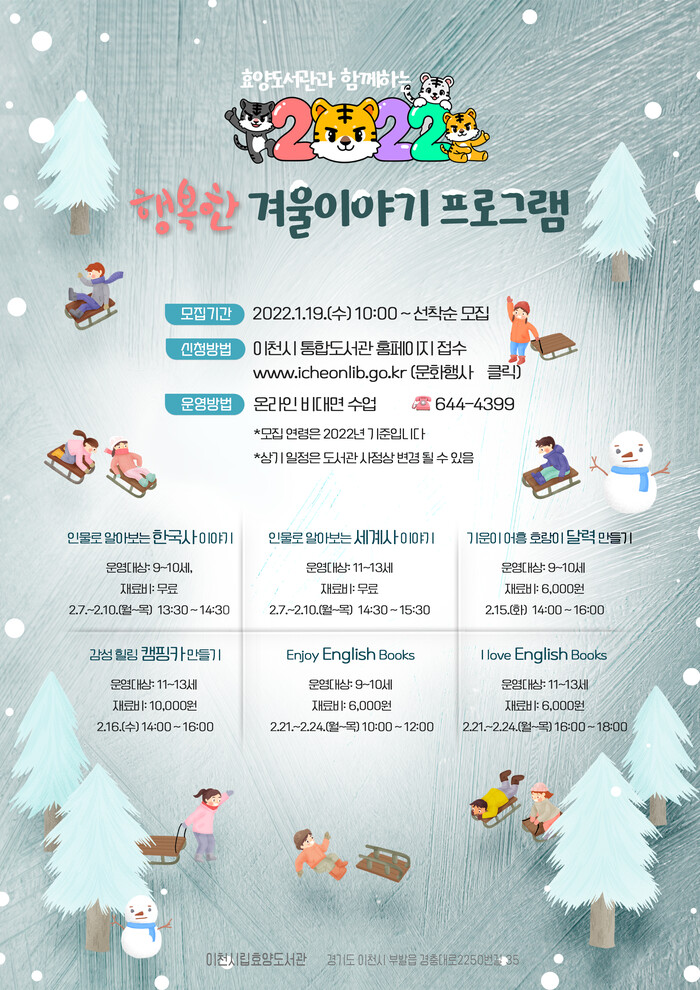 수강생 모집은 2022년 1월 19일부터 도서관 홈페이지(www.icheonlib.go.kr)를 통해 선착순으로 모집하며 자세한 문의는 효양도서관(031-644-4399)으로 문의하면 된다.