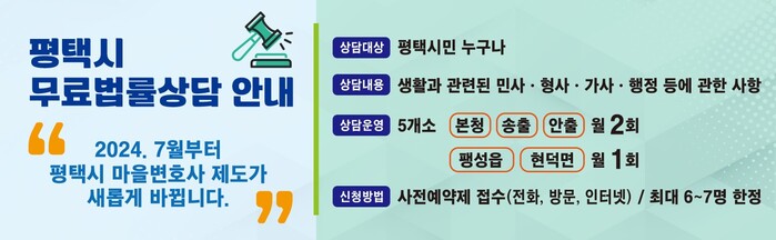 시는 7월 중 기존에 활동하던 마을변호사를 법률상담관으로 위촉할 계획이다. 기타 궁금한 사항은 평택시청 누리집(www.pyeongtaek.go.kr) 참여공간 및 전화(031-8024-2290~1)로 문의하면 된다.