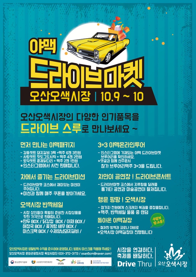 [로컬라이프] 오산시(시장 곽상욱)는 오는 10월 9일부터 10일까지 이틀간 오산 오색시장에서 드라이브 스루 방식으로 ‘오산 오색시장 야맥 드라이브 마켓’을 진행한다.