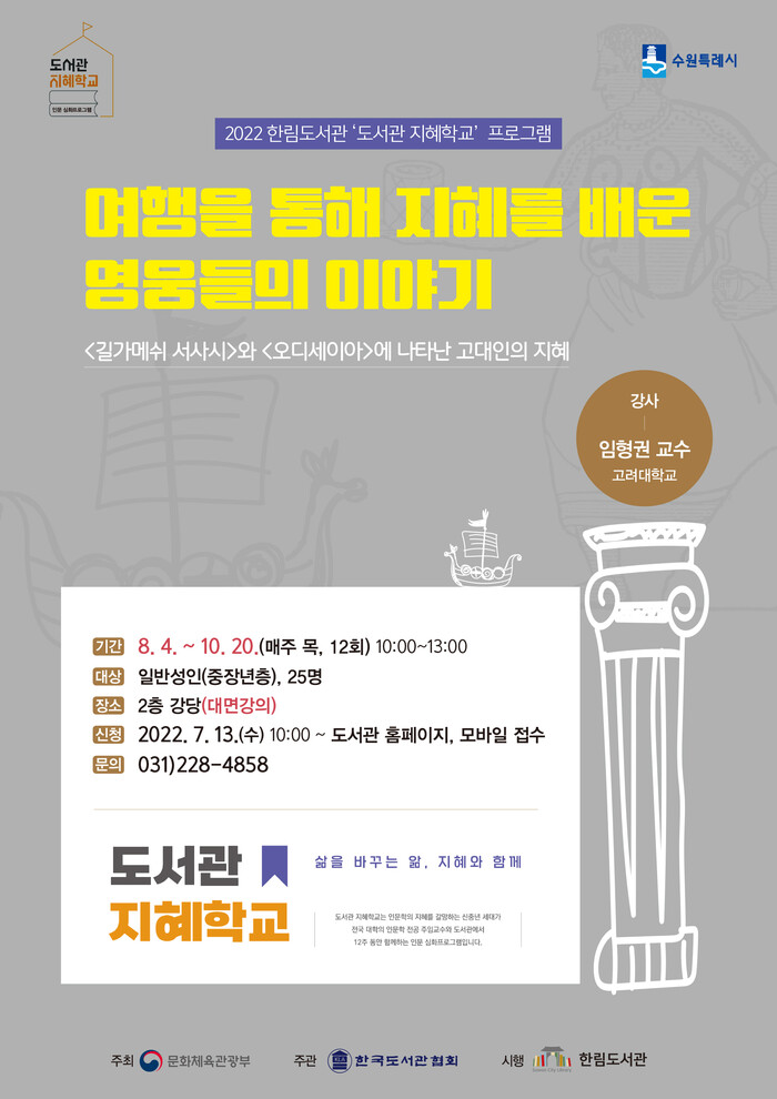 한림도서관 홈페이지(https://www.suwonlib.go.kr/hl) ‘통합예약/신청→독서문화프로그램’에서 ‘도서관 지혜학교: 여행을 통해 지혜를 배운 영웅들의 이야기’를 선택해 신청하면 된다. 무료 교육이다.