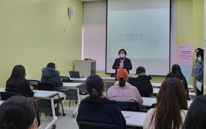 사진/ ‘맘 치유 회복 프로그램’에 참여한 시민들이 강의를 듣고 있다.(사진제공=수원시)