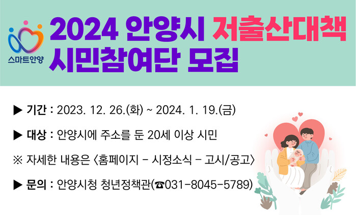 모집 대상은 안양시에 주소를 둔 20세 이상 시민으로 관심 주제(보육・돌봄, 가족 친화・다자녀, 임신・출산, 결혼・주거, 교육・홍보)와 저출산에 대한 의견 등을 기재한 지원신청서를 이메일로 제출하면 된다.
