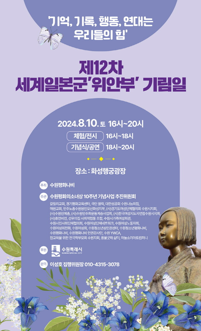 수원평화나비·수원평화의소녀상 10주년기념사업 추진위원회가 주최·주관하는 이날 행사는 기념식과 문화공연, 전시·체험 등으로 진행된다.