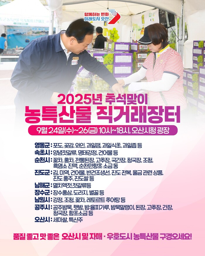 [오산=로컬라이프] 송준형 기자 = 오산시는 올해도 한가위를 맞아 24일부터 26일까지 오산시청 광장에서 2025년 추석맞이 농특산물 직거래장터가 열린다.