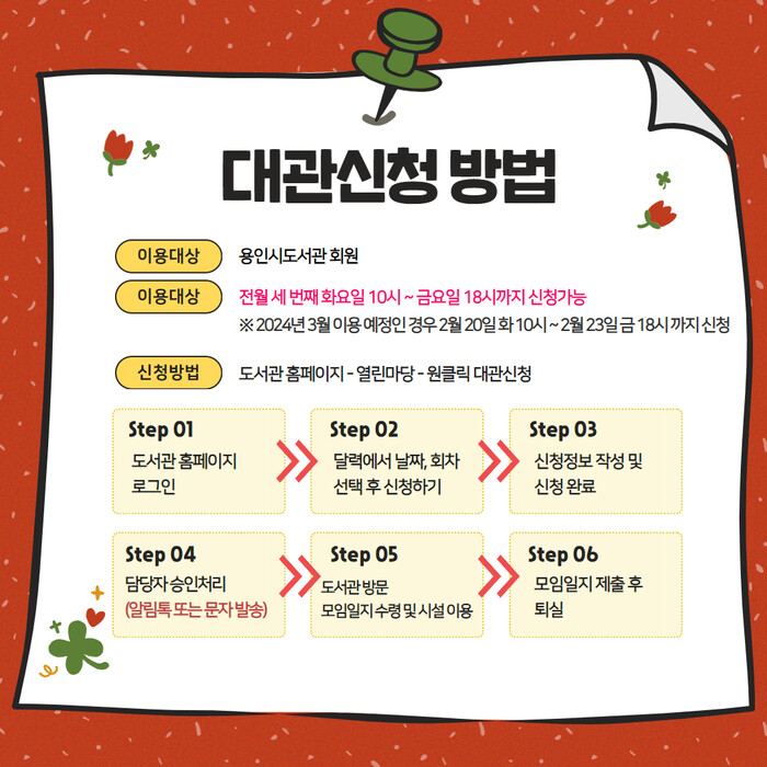 대관 신청은 용인시 도서관 홈페이지(https://lib.yongin.go.kr)에서 회원가입 후 ‘열린마당’ - ‘원클릭대관신청’에서 하면 된다. 신청 기간은 대관일 전월 세 번째 화요일 10시부터 금요일 오후 6시까지다. 대관 신청이 승인되면 문자 또는 카카오톡으로 신청자에 안내한다.