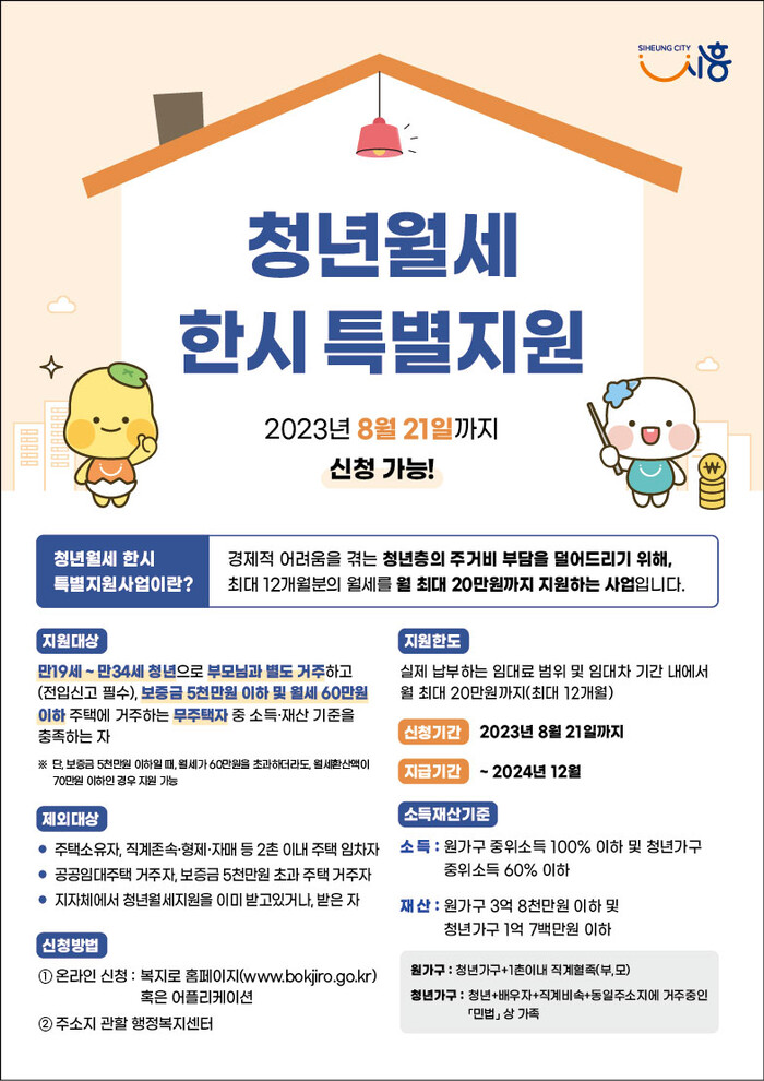 시흥시(시장 임병택)는 저소득 청년층에게 최대 1년간, 월 최고 20만원까지 임차료를 지원하는 ‘청년 월세 한시 특별지원사업’의 신청을 오는 8월 21일까지 받는다고 밝혔다.