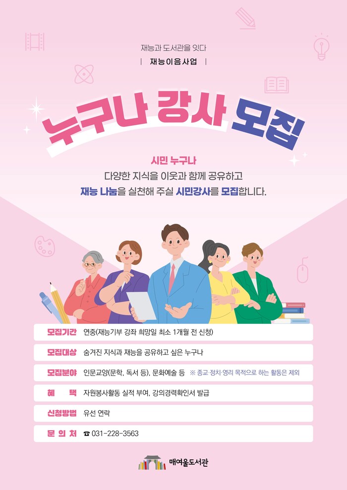 수원시 매여울도서관이 2025년 ‘누구나 강사’ 재능기부 프로그램을 운영한다. 재능을 기부할 강사도 모집한다.