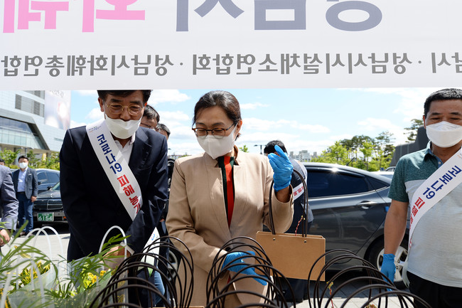 [성남=로컬라이프] 송준형 기자 = 은수미 성남시장은 20일 오후 성남시청 프로그램 주차장에서 친환경 농산물과 화훼를 판매하는 ‘드라이브 스루 직거래 판매 행사’ 현장을 찾았다.