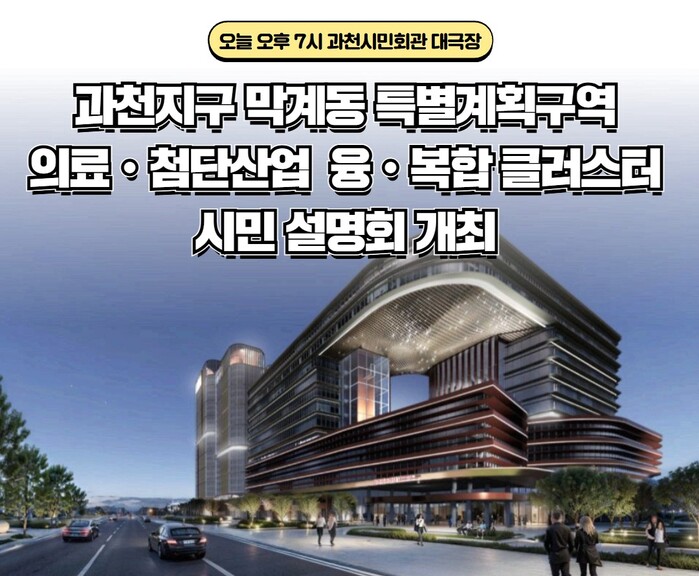 [과천=로컬라이프] 송준형 기자 = 과천지구 막계동 특별계획구역 의료·첨단산업 융·복합클러스터 조성 관련 시민 설명회가 23일, 오후 7시, 과천시민회관 대극장에서 열렸다.