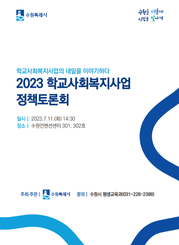 수원시는 7월 11일 오후 2시 30분 수원컨벤션센터 301~302호에서 ‘2023 학교사회복지사업 정책토론회’를 개최한다.