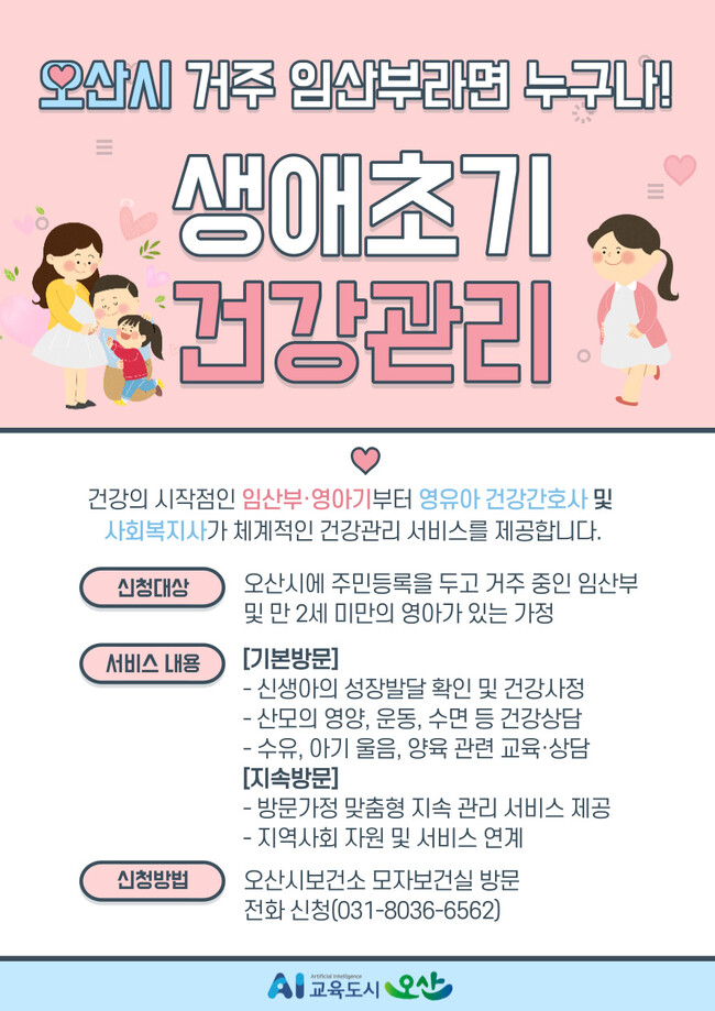 오산시(시장 곽상욱)가 출산정책의 일환으로 임산부와 영아기 대상 전문적·맞춤형 서비스를 지원하는 생애 초기 건강관리 시범사업을 추진한다.