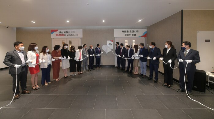 민선8기 오산시장직 인수를 위한 「새로운 오산시대 준비위원회」가 13일 오산문화스포츠센터에서 현판식을 개최하며 본격적인 활동을 개시했다.
