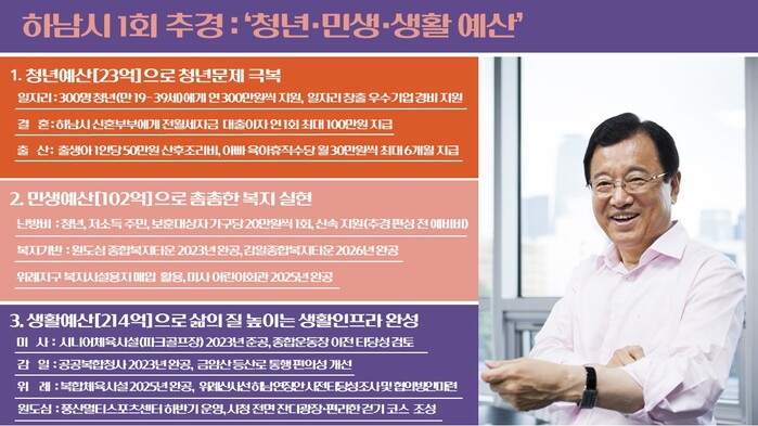 한편 하남시는 이번 추경에 ‘청년·민생·생활예산’과 함께 지하철 5호선 위탁운영비 57억원과 위례 폐기물처리시설 소송 배상금에 16억 4천만원을 편성하는 한편, 풍산동 공공복합청사 건립 23억 1천만원과 하남문화재단 출연금 11억원, 학대피해아동쉼터 운영 9억원, 군량골 도시계획도로 공사 5억원 등 시에 반드시 필요한 정책사업을 추진하는데도 주력했다.