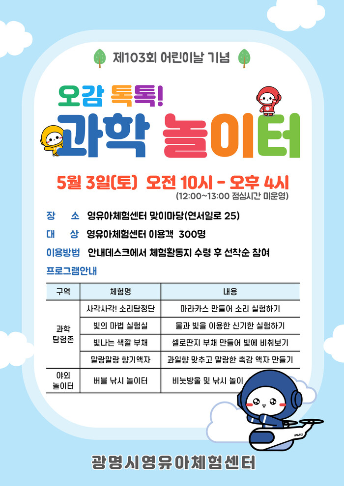 이번 행사는 103회 어린이날을 맞아 마련됐으며, ▲유아가 주도하는 실험 만들기 체험 부스로 구성된 ‘과학탐험존’ ▲가족이 함께 이용하는 ‘버블 낚시 놀이터’ 등 오감을 자극하는 다양한 프로그램이 운영될 예정이다.