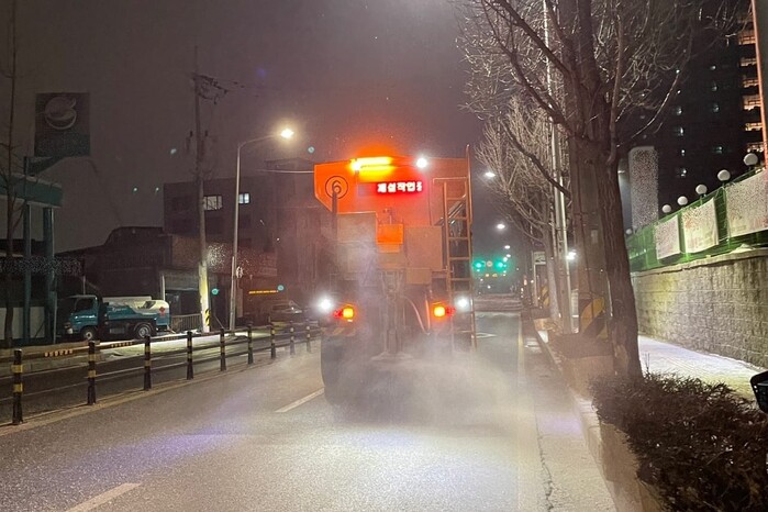 이 시장은 이어 오늘 새벽부터 시 공직자 등 220여 명이 15톤 트럭 34대와 굴삭기 10대 등 차량 90여 대를 활용해 제설작업을 하고 있다며, 작업은 내린 눈이 얼어붙을 것에 대비해 밤새 계속될 예정이라고 말했다.