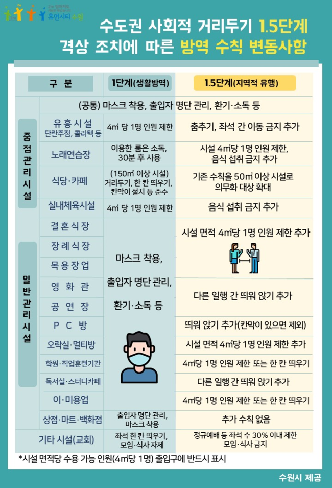 수원시는 지속해서 현장 점검을 하며 변경된 방역 수칙을 안내할 예정이다. 방역수칙을 준수하지 않은 업소는 강력하게 행정 제재를 한다.