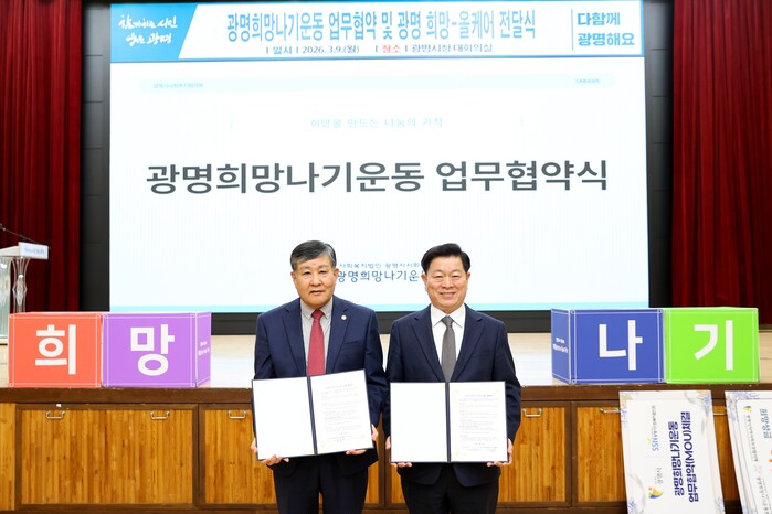 이날 협약식에서는 ‘광명희망나기운동’ 헙무협약과 함께 복지 사각지대 시민 지원을 위한 ‘광명 희망-올케어(All-Care)’ 전달식도 열렸다.