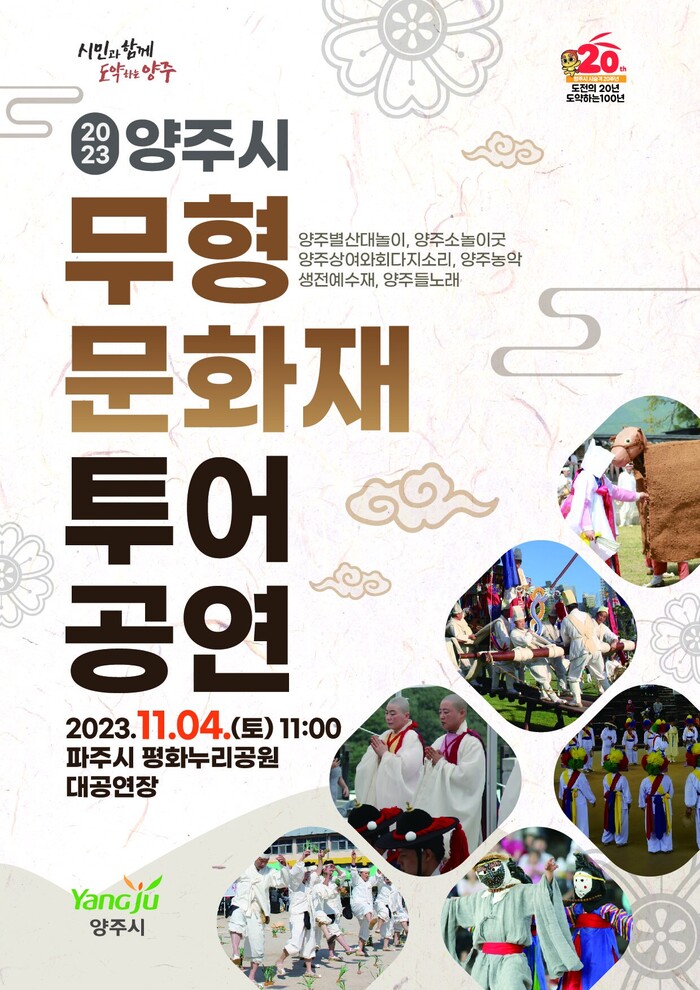 [로컬라이프] 양주시(시장 강수현)는 양주의 대표 무형문화재 6종목을 한자리에서 감상할 수 있는‘2023 양주시 무형문화재 투어공연’이 11월 4일(토) 11시 파주시 임진각 평화누리공원 대공연장에서 열린다고 밝혔다.