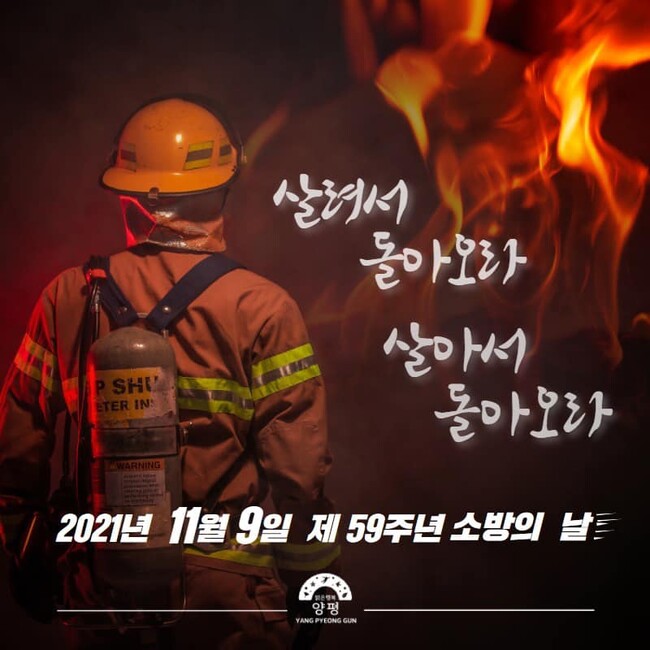 [로컬라이프] 송준형 기자 = 정동균 양평군수는 9일은 제59주년을 맞은 소방의 날, 소방관 여러분의 희생과 헌신에 무한한 감사를 드린다고 밝혔다.