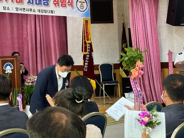 [로컬라이프] 송준형 기자 =전진선 양평군수는 8일, 제11대 양서자율방범기동순찰대 지대장으로 취임하신 윤해중 대장님을 축하했다.