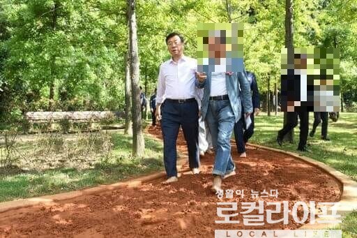 | ▲ 신상진 성남시장이 맨발 황톳길을 걷고 있다. (사진출처=신상진 페이스북) |