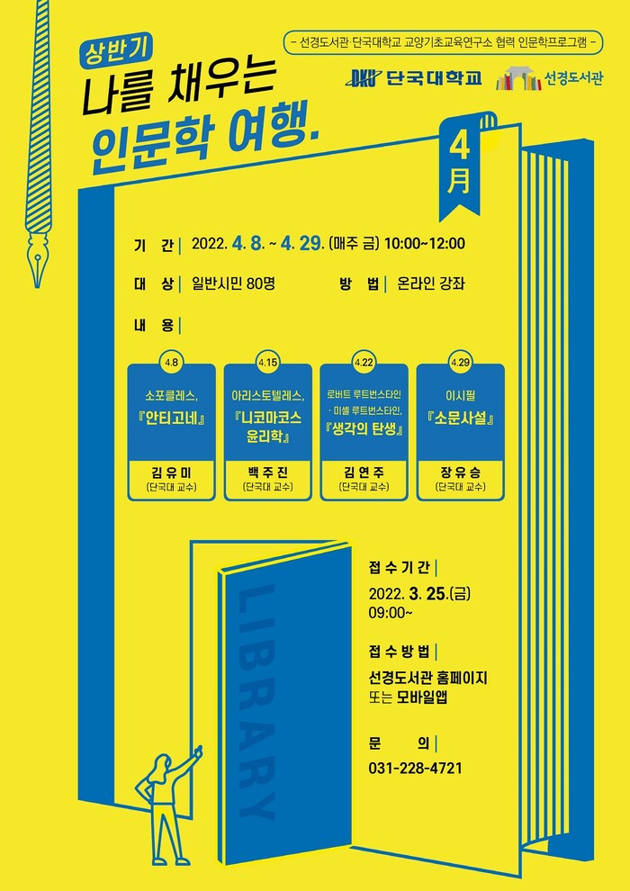 ▲소포클레스의 「안티고네」(4월 8일, 김유미 교수) ▲아리스토텔레스의 「니코마코스 윤리학」(15일, 백주진 교수) ▲로버트 루트번스타인·미셸 루트번스타인 「생각의 탄생」(22일, 김연주 교수) ▲이시필 「소문사설」(29일, 장유승 교수) 등 그리스 희곡부터 한국 고전까지 다양한 주제의 강의가 진행된다.