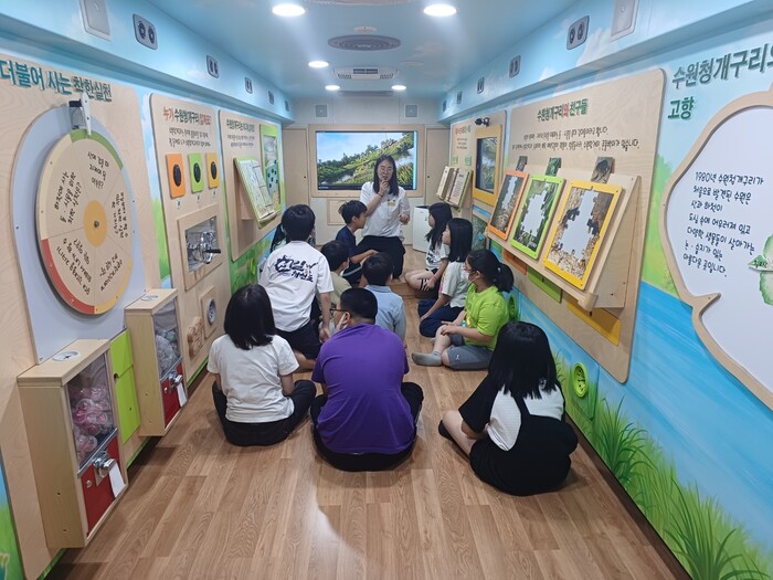 ‘찾아가는 수원이 환경교실’은 생태체험 교육을 할 수 있도록 특수 제작한 버스를 활용해 초등학교에 찾아가 운영하는 체험형 환경교육이다. 초등학교 4학년 학생을 대상으로 전문 강사들이 매주 화·수·목·금요일에 교육한다.