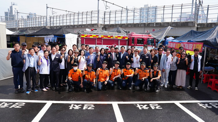 한편, 준공식과 함께 오일장 재배치를 통해 확보한 소방통로를 이용하여 소방차 진입 등 소방훈련을 실시해 비상 상황을 사전에 대비해보는 시간을 가졌다.