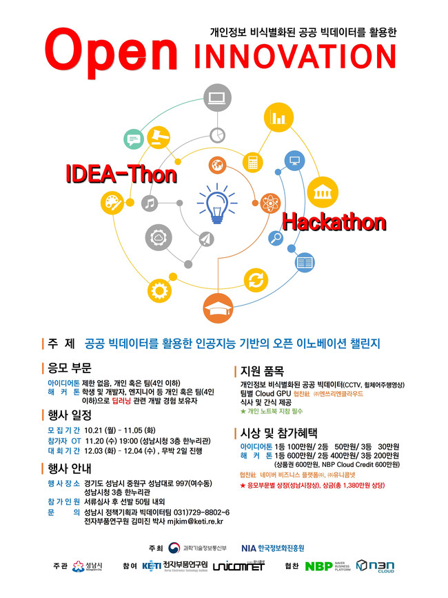 성남시청 8층에 설치하는 ‘교통 자율 주행 빅데이터센터’ 개소(11.15)를 앞두고 인공지능 기반 공공 빅데이터에 관한 획기적인 아이디어를 발굴·활성화하기 위한 대회다.