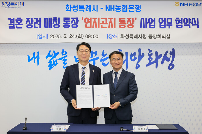 화성특례시(시장 정명근)는 24일 NH농협은행과 결혼 장려 매칭통장 ‘연지곤지 통장’ 사업의 원활한 추진을 위한 업무 협약을 체결했다고 밝혔다.