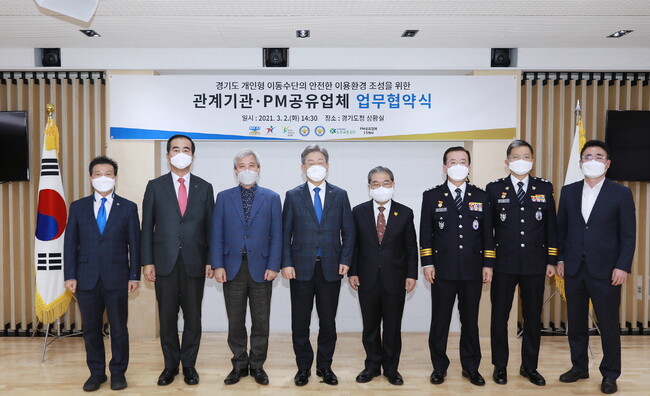 곽상욱 경기도시장군수협의회장(오산시장)은 이재명 경기도지사, 이재정 경기도교육감, 김원준 경기도남부경찰청장, 우종수 경기도북부경찰청장, 이주민 도로교통공단 이사장, 참여 공유PM 대표 등 7개 유관기관장과 함께 개인형이동수단(Personal Mobility, 이하 ‘PM’)의 안전한 이용환경 조성을 위한 협약을 경기도청 상황실에서 2일 체결했다.
