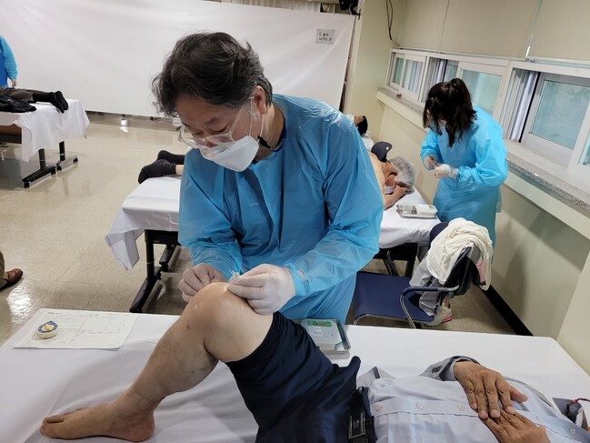 사진/수원자생한방병원 윤문식 병원장이 무릎이 불편한 어르신에게 침치료를 시행하고 있다.(사진제공=자생한방병원)