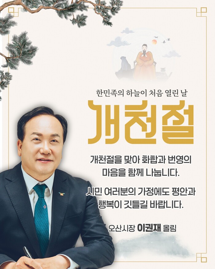 [오산=로컬라이프] 송준형 기자 = 이권재 오산시장은 3일, 사랑하는 시민 여러분, 오늘은 민족 최대 명절인 추석 연휴의 시작이자, 우리 겨레의 뿌리를 돌아보는 뜻깊은 날, 개천절이라고 밝혔다.