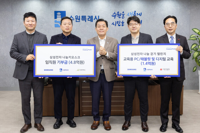 삼성전자 임직원들이 “취약계층 아동을 지원하는 데 사용해 달라”며 ‘나눔 키오스크’와 걷기 봉사(나눔 걷기 챌린지)로 모금한 성금 6억 2000만 원을 수원시에 기부했다.