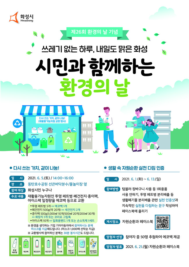 화성시는 재활용가능 자원인 투명 페트병, 폐건전지, 종이팩, 아이스팩을 일정량 모아오면 에코백, 새건전지, 코리요 그립톡 등으로 교환해주고 행사 참여자 중 희망자에게는 봉사시간 30분도 부여한다고 밝혔다.
