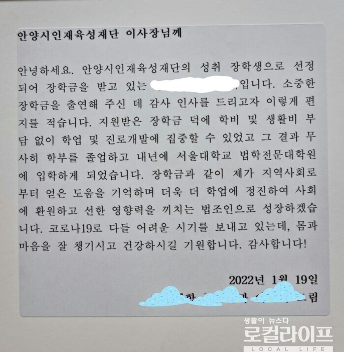 안양시 인재육성재단의 성취 장학생으로 선정돼 무사히 학업을 마치고 내년 서울대학교 법학전문대학원에 입학을 앞두고 있다고 자신을 소개한 A씨는 “최고의 헤드헌터가 되는 것은 인재양성이다”라고 감사 편지에 적었다.