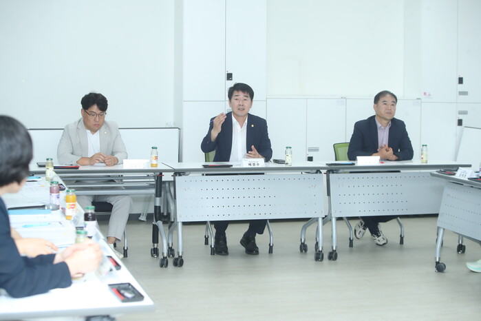 사진/ 동탄호수공원 어울림센터 환경개선 간담회에서 발언하는 배정수 화성시의회 의장(좌측부터 김영수 의원, 배정수 의장, 김상수 의원)(사진제공=화성시의회)