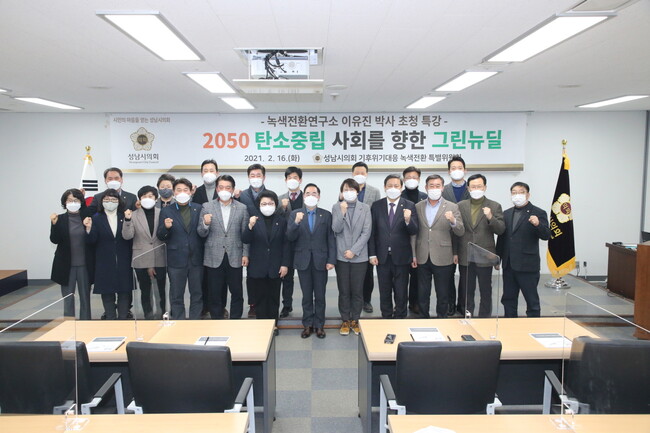 성남시의회(의장 윤창근)에서는 ‘성남시의회 기후위기대응 녹색전환 특별위원회(위원장 조정식)’ 주관으로 2월 16일 성남시의회 4층 세미나실에서 시의원, 관계 공무원이 참석한 가운데 “2050 탄소중립 사회를 향한 그린뉴딜” 이라는 주제로 녹색전환연구소 이유진 박사를 초청하여 특강을 진행했다.