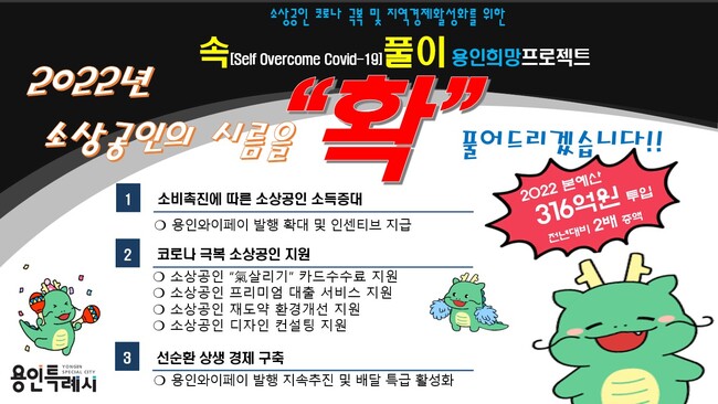 속(Self Overcome Covid-19)풀이 용인희망프로젝트는 용인와이페이 확대 발행 및 인센티브 지급(220억6000만원), 공공배달앱 ‘배달특급’ 활성화(10억원), 소상공인 ‘氣살리기’ 카드 수수료 지원(63억원), 프리미엄 대출 서비스 지원(18억2000만원), 소상공인 재도약 환경개선 지원(2억원) 등 5개의 세부 사업으로 구성됐다.
