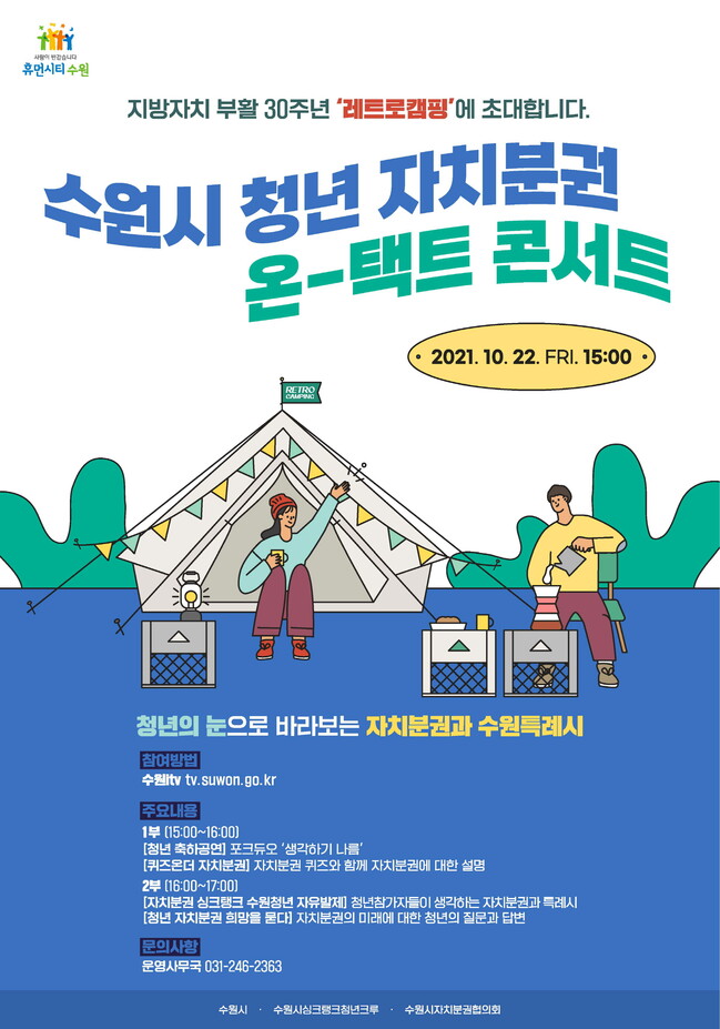 수원시가 지방자치 부활 30주년을 기념해 22일 오후 3시 ‘수원시 청년 자치분권 온-택트 콘서트’를 개최한다.