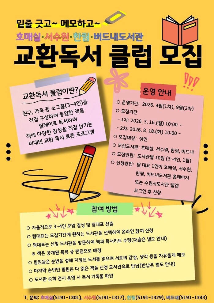 수원시 권선구 4개 공공도서관(호매실·서수원·한림·버드내도서관)이 책을 매개로 서로의 생각과 감상을 나누는 ‘교환독서 클럽’ 참여팀을 모집한다.