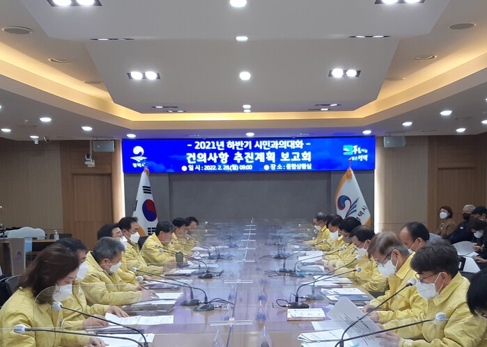 이번 보고회는 25개 읍면동에서 온라인방식으로 진행된 ‘21년 하반기 시민과의 대화’(2021.11.4.~12.30.)에서 건의된 사항에 대해 각 부서별 추진상황을 점검하고 향후계획 등을 논의하기 위해 마련됐다.