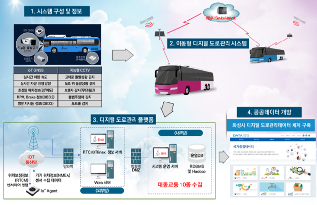 디지털 도로구축시스템은 모빌리티(택시, 버스)를 기반으로 실시간 차량 운행정보 및 돌발상황(땅꺼짐, 무단횡단 등)을 수집하고 초정밀 위치정보까지 융복합하여 사고예방 및 도로 관리에 활용하는 사업이다.
